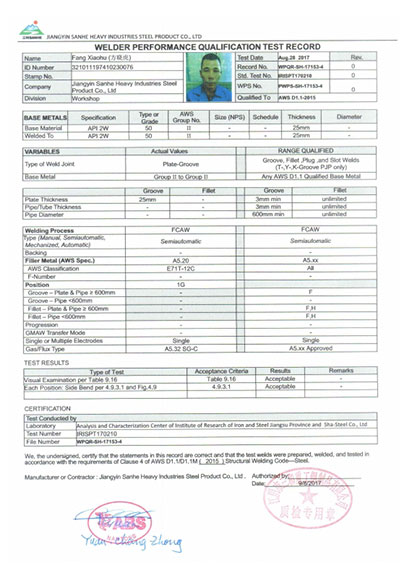江陰市三和重工鋼制品有限公司成立于2012年3月,總投資1.2億,坐落于江蘇省江陰市南閘錦南工業區,占地4萬平方米,廠房面積3萬平方米。專業從事大口徑厚壁直縫埋弧焊接(LSAW)鋼管、方管、錐管,RBE卷制埋弧焊接鋼管的研發、生產和銷售。公司憑借著嚴謹的產品質量管理,先后通過了ISO三體系認證,RS、BV等船社級工廠認證,同時取得了CE CPR,API2B等歐美地區資質認證。公司擁有一條完整的,可以生產單支長度達到12米的JCO直縫埋弧焊鋼管生產線(品牌:美國林肯) ,3套卷管生產線以及異型管生產線。公司主要產品有各種大小厚壁直縫埋弧焊管、卷管、方管、矩形管、錐管、多邊形管等,主要以厚壁管為主。可按國家標準GB9711 、GB50250 系列 ,國際標準API? SPEC 2B及EN10210、EN10219、EN10208、 A671、A672等生產各種規格鋼管,年綜合產能達20萬噸,產品廣泛應用于海上 石油鉆井平臺、輸煤漿、輸水、特高壓輸電鐵塔電,石油化工、高層建筑鋼結構建筑工程、大型海洋碼頭樁管等領域。公司擁有一支由我國制管行業領先的技術團隊,并與國內制管技術與工藝方面的專家、科研院所建立了密切的合作關系, 研發能力處于國內先進水平,專門生產厚壁鋼管。為擴大產能,滿足對客戶長直管的需求,2023年11月30日,在靖江:江陰-靖江工業園區成立了三和重工的全資子公司:江陰市永祥鋼制品有限公司,可以對接環焊總長超過三十米的焊接鋼管及各類型鋼結構產品。江陰市三和重工鋼制品有限公司扎根于江陰,放眼于全球,通過持續的產業規模擴張和技術提升,立志成為大直縫埋弧焊管行業具有國際影響力的企業。